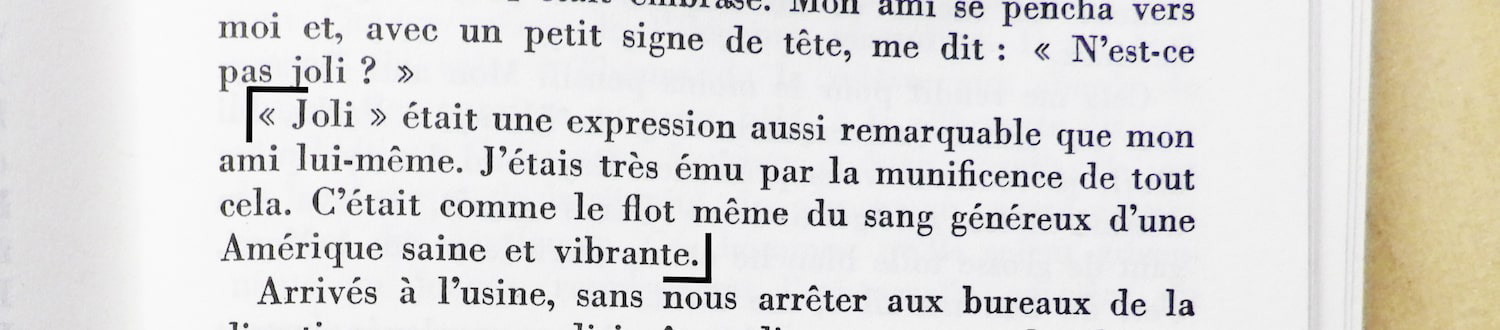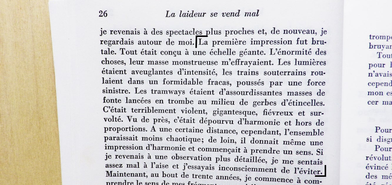 La France d’alors est très en retard sur les États-Unis du point de vue de l’industrialisation. La seule expérience qu’il peut rapprocher du tumulte qu’il découvre est celle de la guerre, souvenirs qu’on peut supposer d’autant plus présents qu’ils sont récents et probablement traumatisants. De temps en temps, Lœwy prend le ferry et s’échappe de New York : « Ces escapades étaient rassurantes. Dès que je regardais les choses d’assez loin elles retrouvaient une échelle, se fondaient harmonieusement et je retrouvais le calme. Le profil que New York découpe sur le ciel n’était pas seulement magnifique, il était parfait. » Cette citation laisse penser que ce qui rend le profil de New York « parfait » tient moins de son dessin que de la sensation de calme qu’il procure à Lœwy. À l’inverse, ce qui rend la ville laide, c’est le désordre qu’elle manifeste. Ce chaos ne correspond pas à l’image de la ville moderne qu’il s’était figurée : « J’avais imaginé que les machines, les objets étaient simples, élancés, silencieux et rapides [...], ils étaient rapides, mais encombrants, bruyants et compliqués. » Toute cette technologie lui apparaît oppressante alors qu’elle est supposée améliorer la vie des gens. Cet environnement dénué d’harmonie ne peut être l’image du progrès en marche.