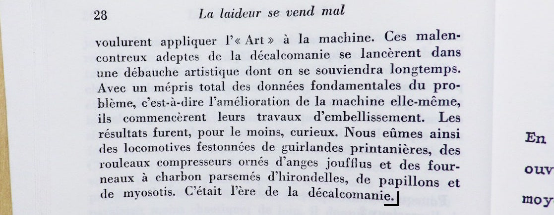 Dans son livre, Lœwy parle de l’esthétique industrielle au singulier. Pour lui, il n’y a pas plusieurs esthétiques possibles, mais une seule bonne et il semble que ce soit la sienne. On pourrait penser que cette esthétique repose sur une idée subjective de la beauté, et c’est le cas dans un certain sens. Mais cette idée du beau est d’autant plus intéressante qu’elle se construit sur une expérience singulière et sur la vision d’une société idéale. Les observations du Gestetner et de la locomotive GG1 vont à présent nous amenés à mieux comprendre cette idée de la beauté propre à Lœwy.