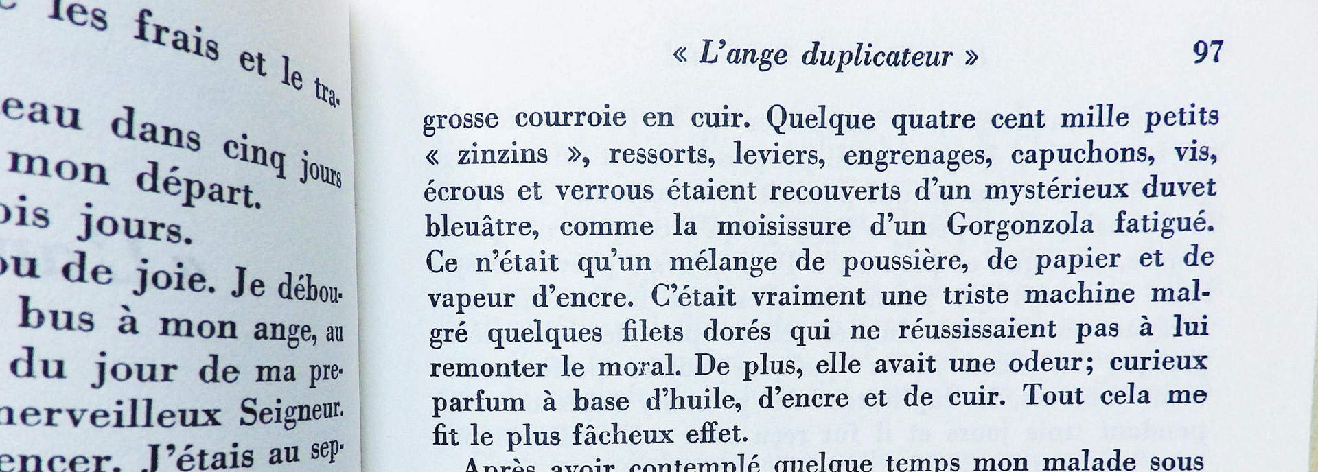 En comparant le duplicateur avant et après l’intervention de Lœwy, une première chose saute aux yeux : cette intervention a essentiellement consisté en un recouvrement ou un camouflage. Dans sa première version, tous les composants du duplicateur sont visibles. Rien ne les cache à notre vue. L’essentiel de la machinerie d’apparence complexe (assemblage de petites pièces connectées entre elles par des pièces plus grandes de formes rondes, carrées ou tubulaires... et une grande roue sur le côté) repose sur un épais plateau. Sur le pourtour de ce plateau, apparaissent deux gros boutons ronds ; sur un côté, le plateau est prolongé d’une tablette servant probablement à poser les documents à dupliquer. La machinerie est surmontée d’une lampe à la tige fine qui rappelle une antenne. L’ensemble repose sur quatre pieds fins et tubulaires décrivant des S. Entre ces quatre pieds, un meuble composé d’un tiroir haut et de deux plus petits donne la sensation d’un gros corps sur quatre petits pieds. On imagine que le tout doit mesurer entre 1,30 mètre et 1,50 mètre. La description qu’en fait Lœwy dans le chapitre « L’ange duplicateur » de son ouvrage mérite qu’on s’y arrête.