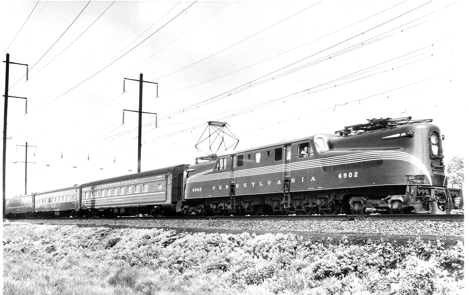 La locomotive présente un corps compact, comme un bloc hermétique et noir. Différents éléments ressortent par contraste sur ce noir, à commencer par le phare de la locomotive, œil rond qu’elle porte au milieu du front. En dessous de cet œil, un encadré rouge aux contours dorés indique le numéro d’identification du train. Sur les flancs de la machine, une bande de cinq lignes dorées court à l’horizontale avant de piquer vers l’avant sur le nez de la locomotive. Elle met en valeur la forme aérodynamique. Au dessus de cette bande, le logo de la compagnie dans un encadré rouge et en dessous de la bande, le nom « Pennsylvania » s’étalant en lettres capitales dorées également, accompagné du numéro d’identification répété de chaque côté. L’ensemble coloré noir avec les détails dorés et rouges donne au train une allure grave et élégante à la fois. Du point de vue de sa forme, la locomotive vient s’affiner vers l’avant qui décrit un arrondi assez large. Vue de face, elle est de forme légèrement conique, ce qui exagère l’effet de perspective et accentue son aspect imposant. Le tout a quelque chose d’agressif et rappelle une arme de guerre. Il n’y a que les touches dorées qui adoucissent cet effet en lui conférant une élégance masculine tout en sobriété.