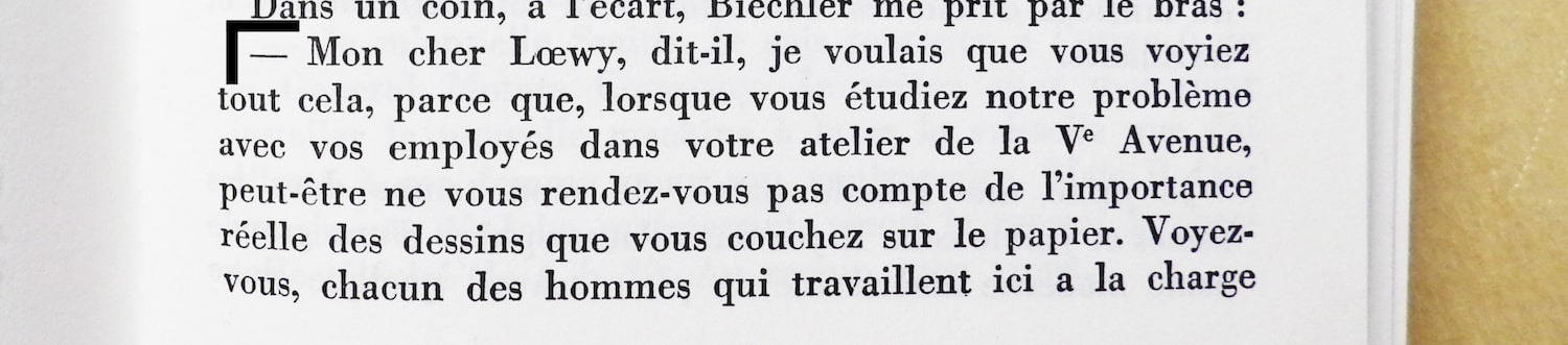 Pour Lœwy, la beauté est donc une question d’harmonie et de proportion ; vision très classique. Mais dans une ville comme New York, la question des proportions prend une autre importance. Dans la ville, Lœwy est dépassé par la rumeur des activités. Mais quand il s’en éloigne, elle retrouve alors une échelle abordable, et cela donne à Lœwy un sentiment de maîtrise sur cet environnement urbain. La beauté de la ville se situerait donc dans les conditions de notre rapport à elle. L’esthétique n’est pas une chose qui vient se superposer à l’ob- jet, mais qui vient de l’objet même, de la manière par laquelle il nous permet d’accéder à lui. Dans son chapitre « Le caporal Lœwy », il raconte comment on procédait en ce début du XXe siècle pour améliorer l’aspect des machines :