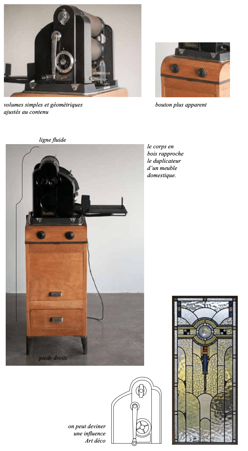 On comprend ce que Lœwy reproche à l’apparence de la machine, d’une part, un manque d’harmonie et une disproportion des parties entre elles. Mais aussi son apparente complexité avec ses « quatre cent mille petits zinzins ». Il constate également que l’appareil est recouvert d’une graisse poussiéreuse et que cela lui donne une mauvaise odeur. Après son intervention, le duplicateur donne la sensation d’être plus robuste et fiable. Sa silhouette auparavant trapue a gagné en élégance. Elle semble plus fine et ses pieds, au lieu de se disperser en courbes aux quatre coins, sont à présent droits et bien rangés. Son corps, auparavant en aluminium noir, est à présent en bois, et fait qu’au lieu de rappeler le contexte d’une usine sale et bruyante, on l’imagine sans peine dans un bureau moderne et confortable. La machinerie est recouverte d’un carénage dont les volumes simples et géométriques sont ajustés au contenu et le laisse deviner. L’antenne-lampe a disparu, probablement intégrée au corps de la machine.