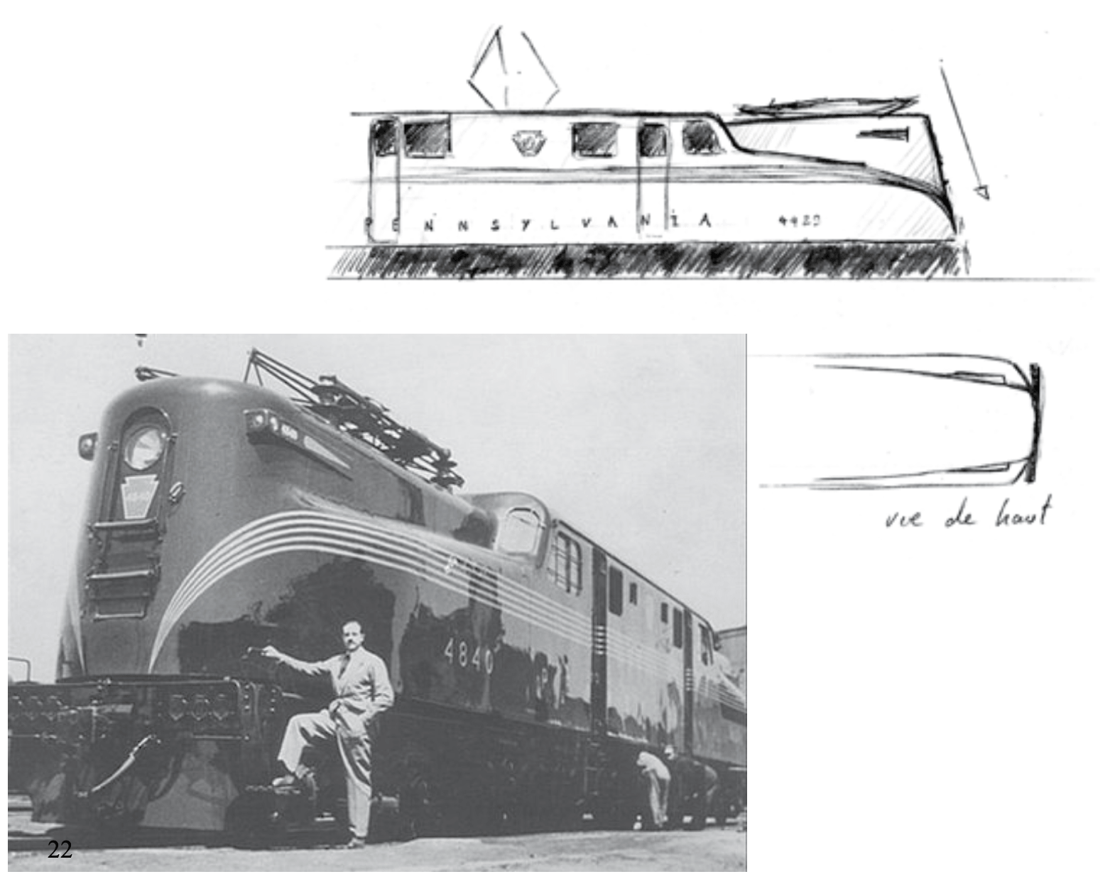 Avec la locomotive GG1, Lœwy procède de la même manière qu’avec le duplicateur. Il travaille à partir d’un modèle existant auquel il superpose un capot. Le reproche qu’il fait au premier modèle est le même que celui adressé au Gestetner : il a « quelque chose d’hétéroclite », il manque de cohérence et d’harmonie dans les volumes. L’objectif que se fixe Lœwy est d’apporter cette harmonie par une économie de moyens.