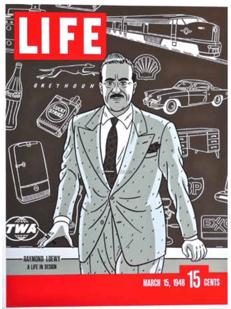 Or cette recherche de simplicité n’est pas qu’une question esthétique. Elle se prolonge dans les questions tech- niques par la notion d’économie de moyens. Ses projets de locomotive démontrent bien la logique qui lie sobriété esthétique et économie de moyens. Cela correspond à une vision d’ensemble, née de l’observation de la ville et de son désordre. Cette logique, Lœwy l’applique à tout type de projet. Que se soit dans le design automobile, l’aménagement des boutiques, le stylisme, le packaging, ou encore qu’il s’agisse de produits de luxe ou de la grande distribution. Si beaucoup de ses projets sont encore d’actualité, comme la bouteille Coca-Cola, le logo Shell ou le paquet de Lucky Strike, c’est justement que Lœwy n’a pas cherché à être dans la séduction sur le moment. Il a développé une esthétique de l’essentiel qui s’adresse aux aspirations de l’Homme. Il avait un projet pour la société. Celui de produire pour elle un environnement qui lui permette de poursuivre la quête du progrès. Il la voyait progresser fluide et calme, comme un train qui glisse sans résistance et que rien ne semble pouvoir arrêter.