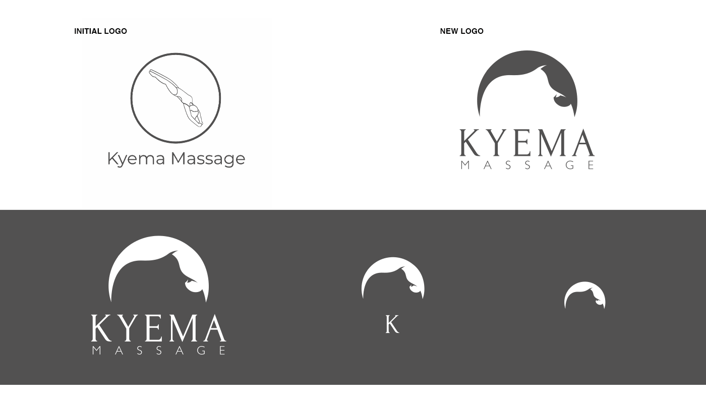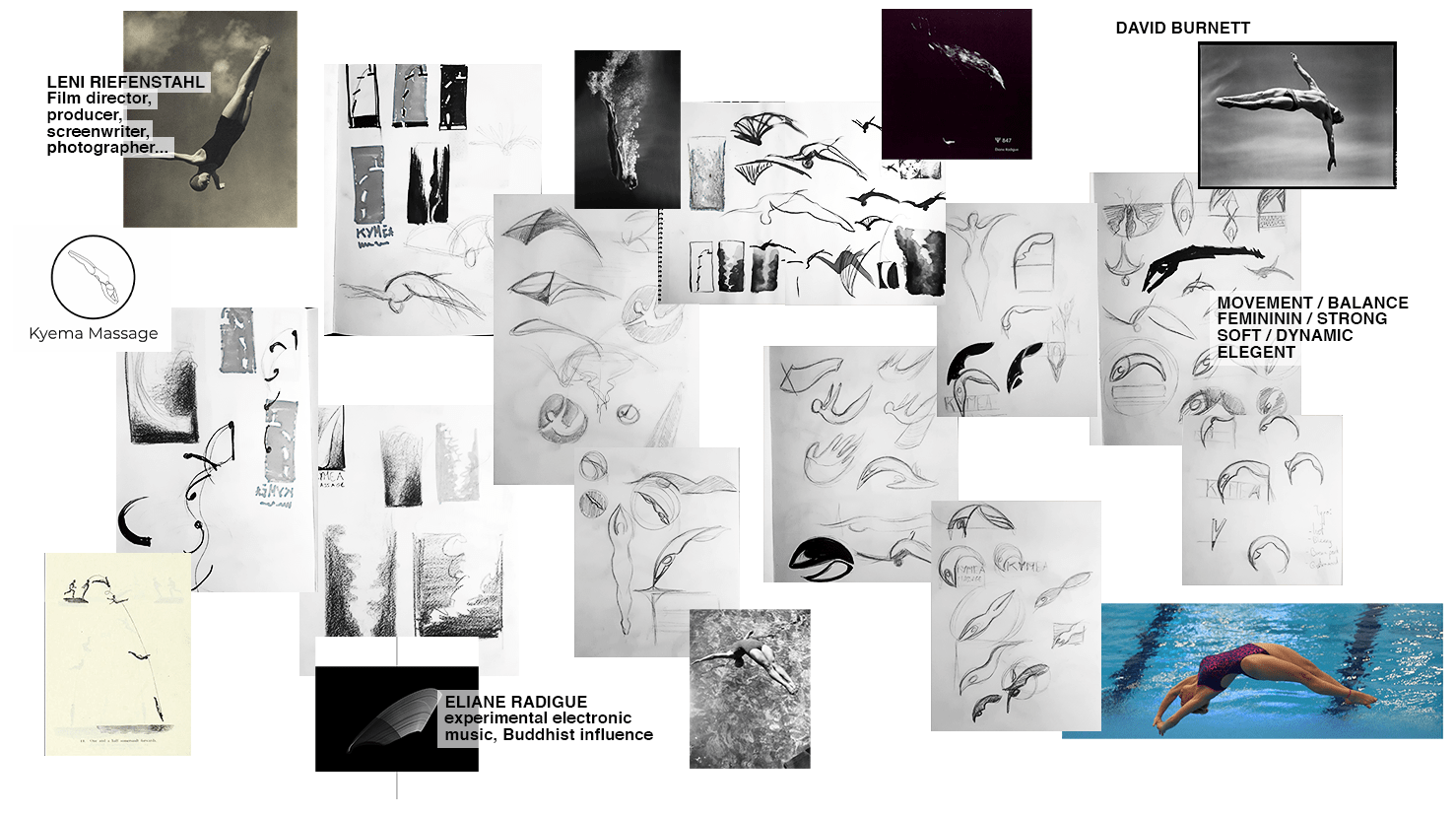 I was initially uncertain whether a woman diving would be a good concept for Kyema's logo. Isolated from the context of the pool, a diver is nothing else but a body falling to the ground with all its tragic implications, however, it was during our first meeting that Chloe convinced me by telling me about her idea of a massage. For her, the experience of a massage is a dive into oneself as well as an awakening of ones body; a moment of letting go, and a way to find a form of control.